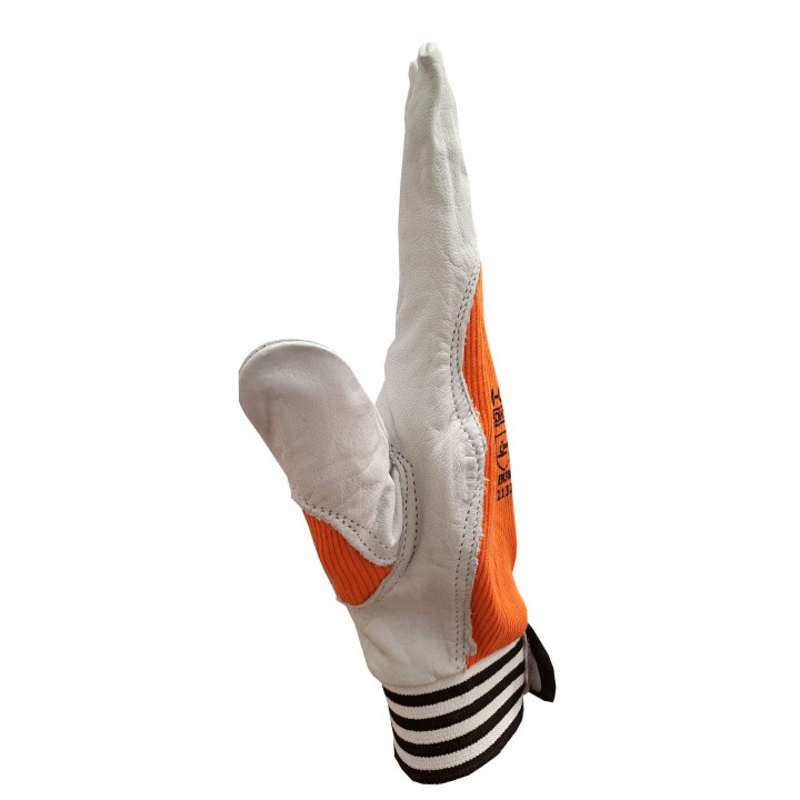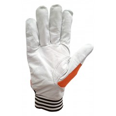 Working gloves made of soft grain leather in a natural color. The wrist on the dorsal part is tightened with an elastic band, the cuff is finished with a trim. They provide excellent grip.