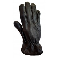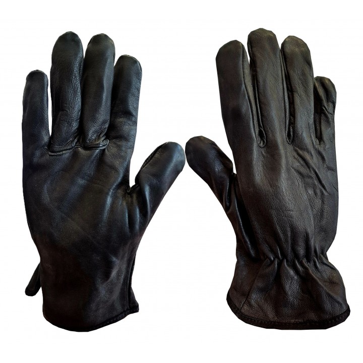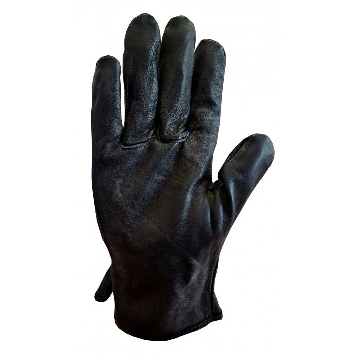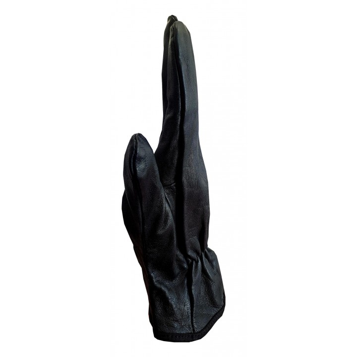 Work gloves made of soft black goat grain leather. Elasticated wrist on the back, cuff finished with piping. Provide excellent grip.