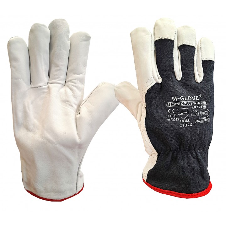 Insulated protective gloves made of full-grain leather. The inner glove is made of thick fleece fabric (65% cotton, 35% polyester), providing warmth and comfort. Elasticated wrist closure at the back, cuff finished with a ribbed trim. These gloves are ideal for use in low-temperature environments, such as warehouses and cold stores.