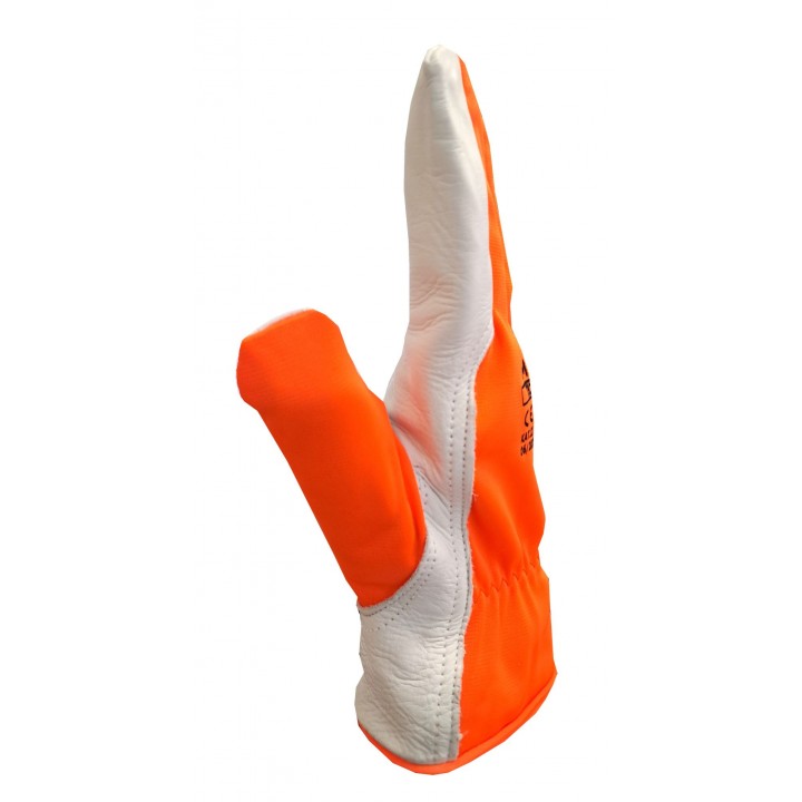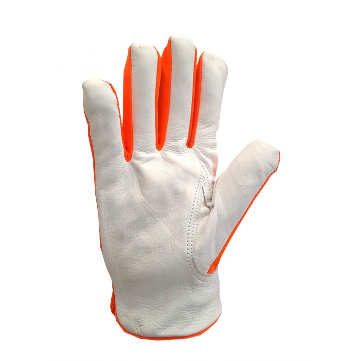 Protective gloves made entirely of white leather. The palm part is made of grain leather, while the cuff is made of cowhide split leather. The pot and the top part are made of one piece of leather, thanks to which they show greater durability and resistance to abrasion.
