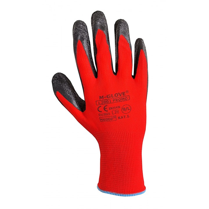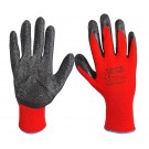 Rękawice ochronne z czerwonej elastycznej dzianiny poliestrowej, bez szwów, powlekane w części chwytnej czarnym nitrylem, zakończone elastycznym ściągaczem.