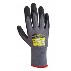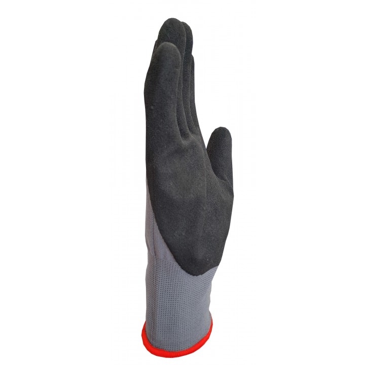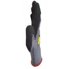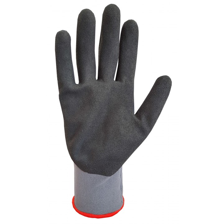Rękawice ochronne wykonane z czerwonej dzianiny poliestrowej, powlekane miękkim odpornym na ścieranie lateksem w kolorze czarnym. Struktura gumy zapewnia wyśmienitą zręczność i bardzo dobrą przyczepność.