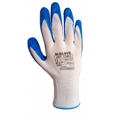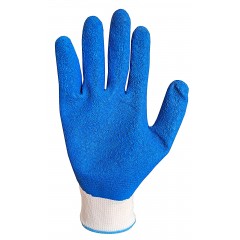 Rękawice ochronne wykonane z białej dzianiny poliestrowej, powlekane miękkim odpornym na ścieranie lateksem w kolorze niebieskim. Struktura gumy zapewnia wyśmienitą zręczność i bardzo dobrą przyczepność.
