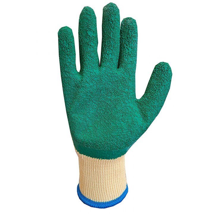 Rękawice z dzianiny powlekane szorstkowanym lateksem, ścieg 10G. Zakończone elastycznym ściągaczem.