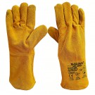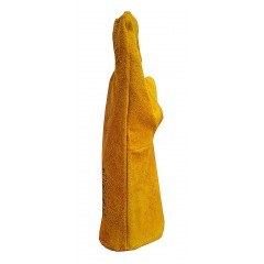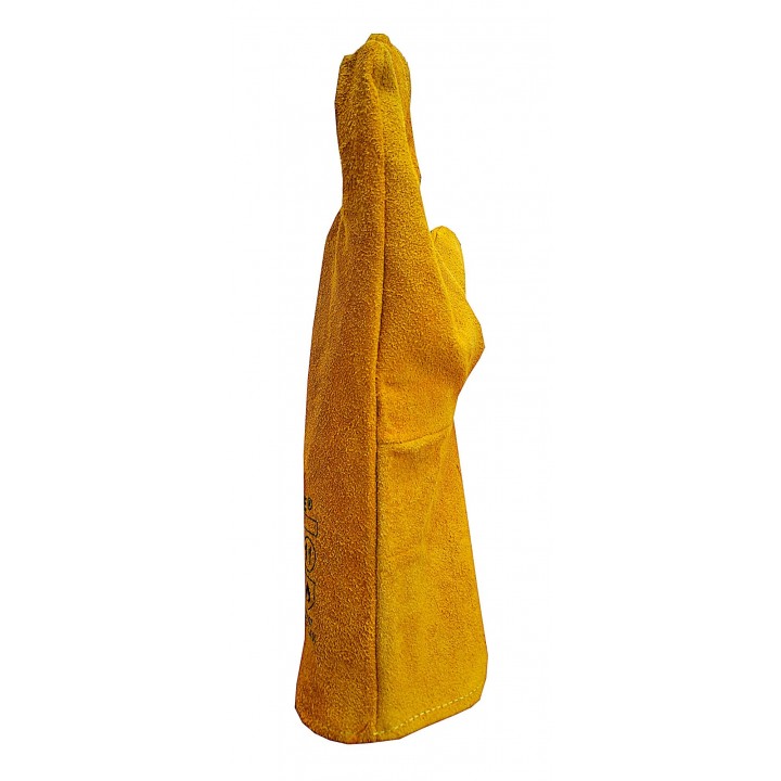 Rękawice ochronne w całości wykonane z dwoinowej skóry bydlęcej w kolorze musztardowym. Szwy zewnętrzne (niepalne). Od wewnętrznej strony dłoni pomiędzy kciukiem a palcem wskazującym dodatkowa warstwa skóry, która ma za zadanie wzmacniać rękawice w miejscu bardziej podatnym na uszkodzenia mechaniczne. Część chwytna rękawicy wykonana z jednego kawałka skóry, dzięki czemu wykazują większą wytrzymałość i odporność na przetarcia. Rękawice są całoskórzane - wykonane ze skóry, włącznie z mankietem sięgającym do połowy przedramienia, chroniąc w ten sposób przed przemiękaniem oraz zabezpieczając nadgarstek przed urazami. Długość rękawicy 35 cm.