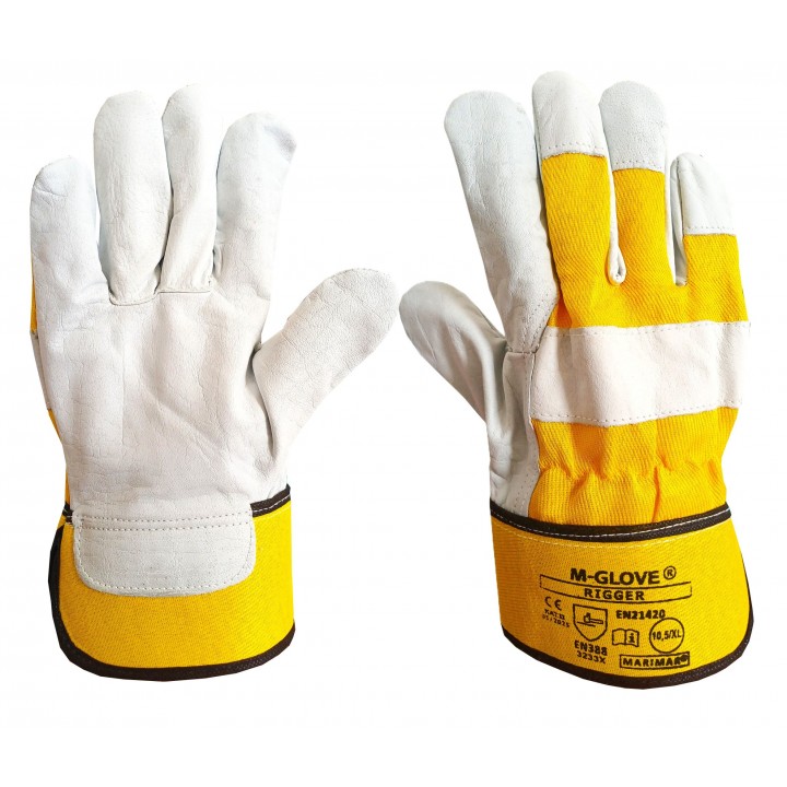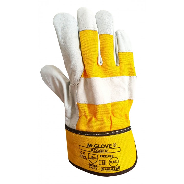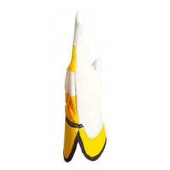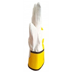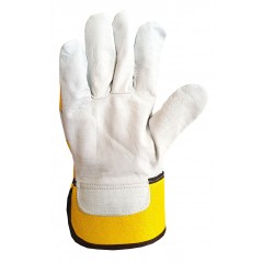 Rękawice ochronne wykonane z żółtej tkaniny drelichowej wzmacniane skórą licową w kolorze białym. Podgumowany sztywny mankiet.