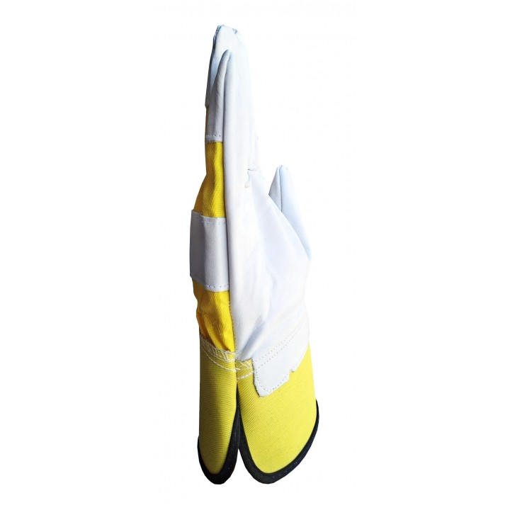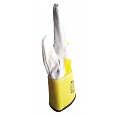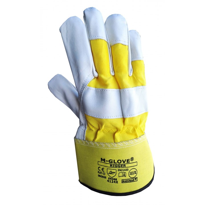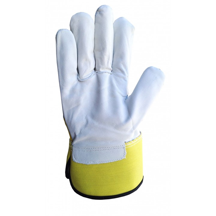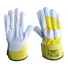 Rękawice ochronne wykonane w części chwytnej ze skóry licowej. W części wierzchniej z dzianiny bawełniano-poliestrowej. Końcówki palców wzmocnione skórą licową. Podgumowany sztywny mankiet.