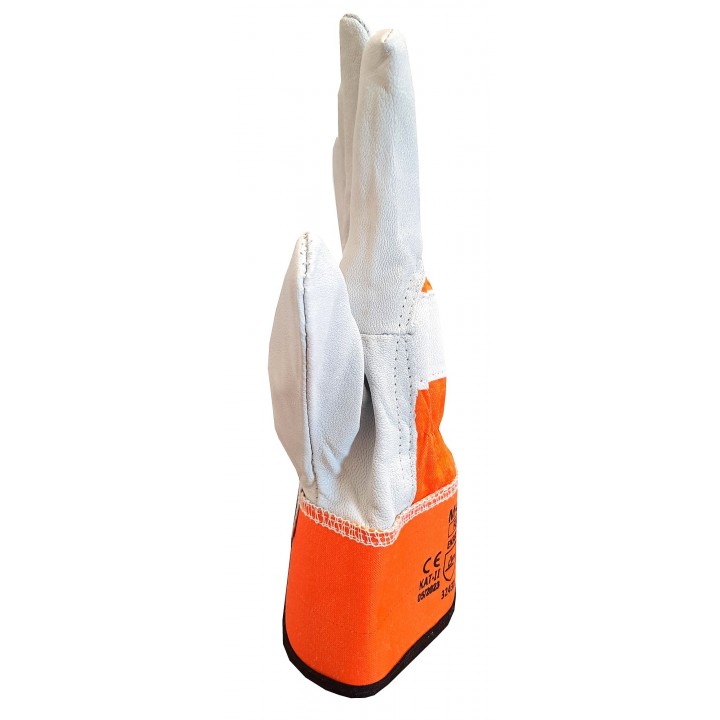 Rękawice robocze wykonane z miękkiej skóry licowej w naturalnym kolorze. W nadgarstku na części grzbietowej ściągnięte gumką, mankiet zakończony lamówką. Zapewniają doskonałą chwytność.